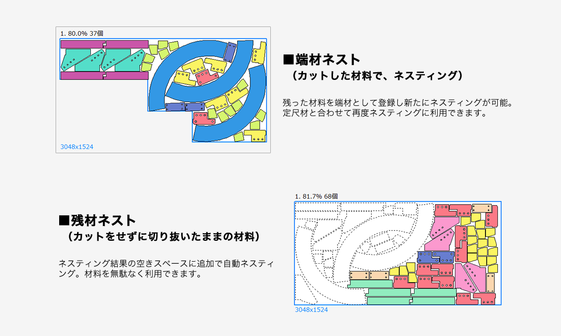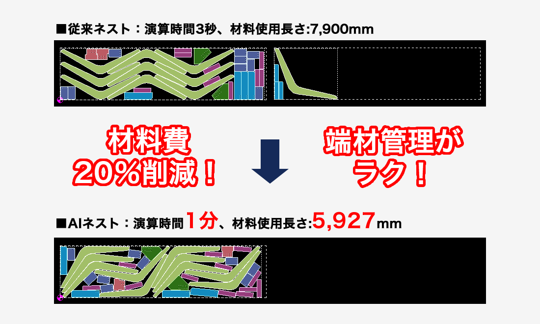 新ネストエンジン「AIネスト」の発売により、世界トップレベルのネスティング歩留まりが実現し、材料費や人件費を大幅に削減することが可能になりました。