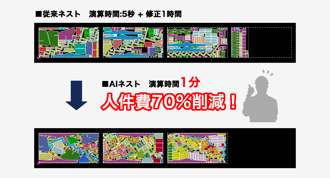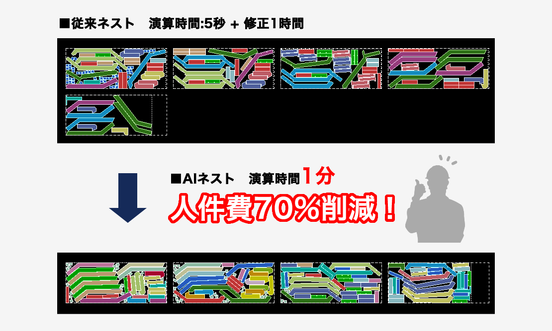 従来のネスティングソフトでは、ネスト演算にかかる時間は早かったものの、歩留まりには限界があり、ネスト後の手動での配置修正作業にかなりの時間がかかっていました。新自動ネスティングソフト「AIネスト」では、手動配置を超える歩留まりで配置修正がほぼ不要になり、配置修正にかけていた作業時間を短縮でき、平均70%の人件費を削減できます。