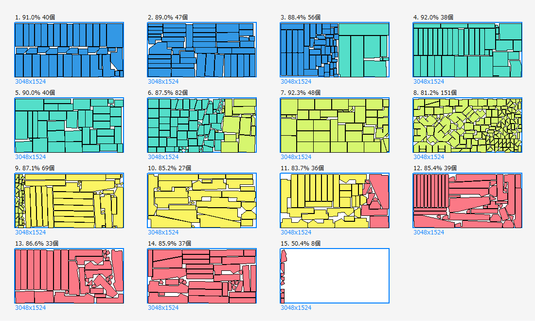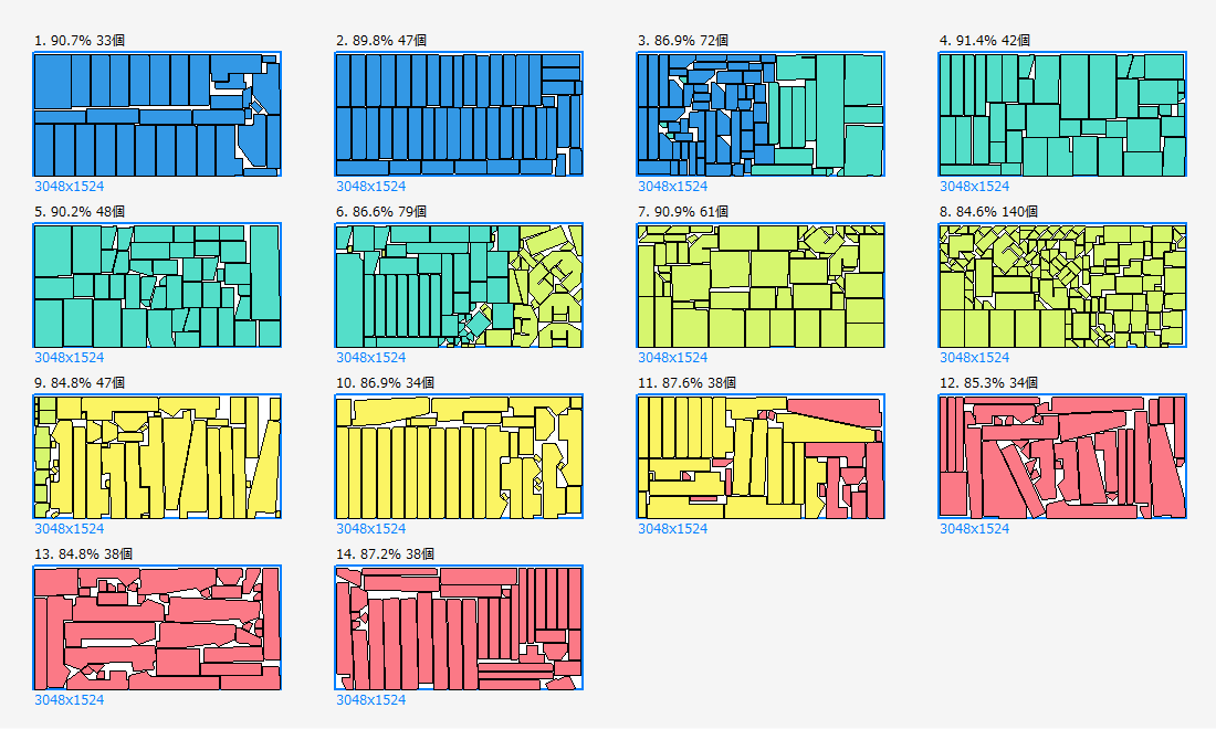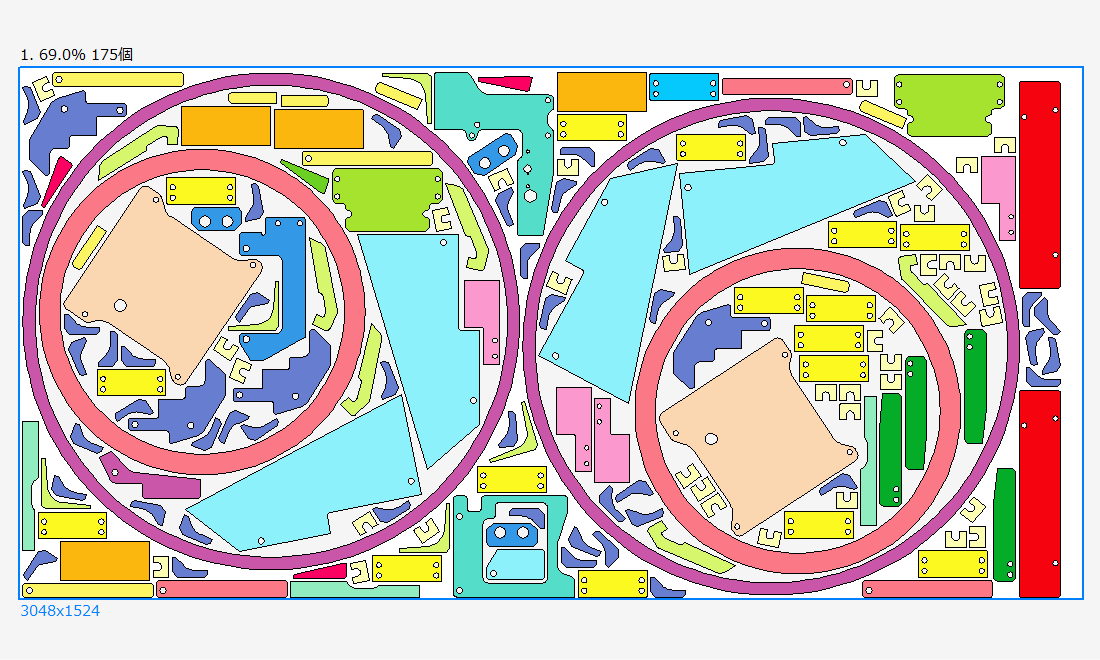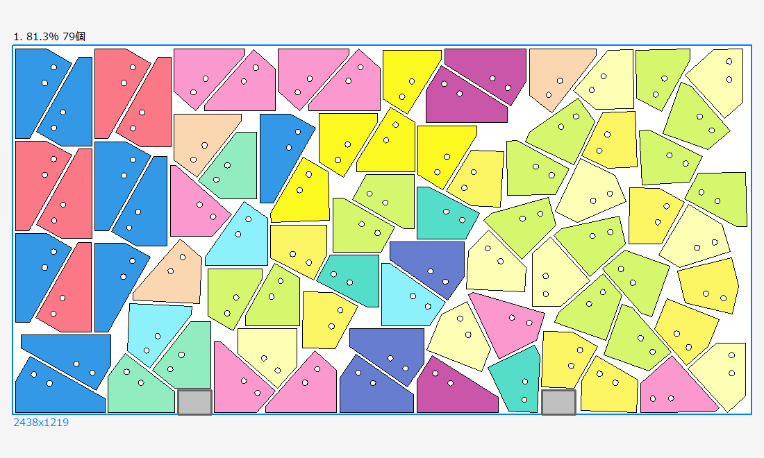 客先別や物件別ごとで部品の配置エリアを分けて自動ネスティングし、エリア毎や部品毎で色分け表示